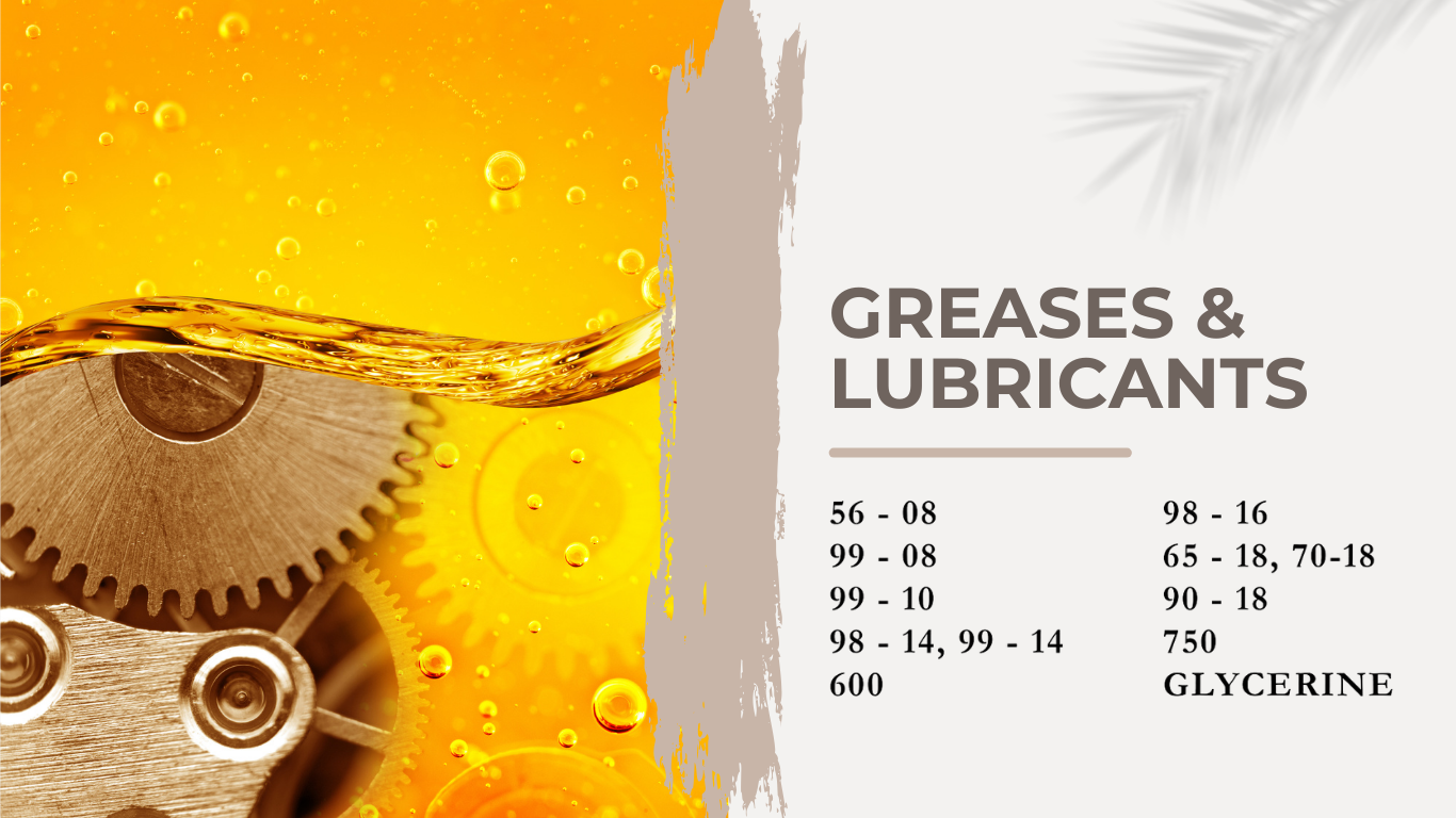 Summit Globe Trade provides palm oil–based oleochemicals for greases and lubricants, offering excellent stability, viscosity, and biodegradability. Our eco-friendly solutions ensure high performance and sustainability, meeting the needs of industrial, automotive, and machinery applications worldwide.
