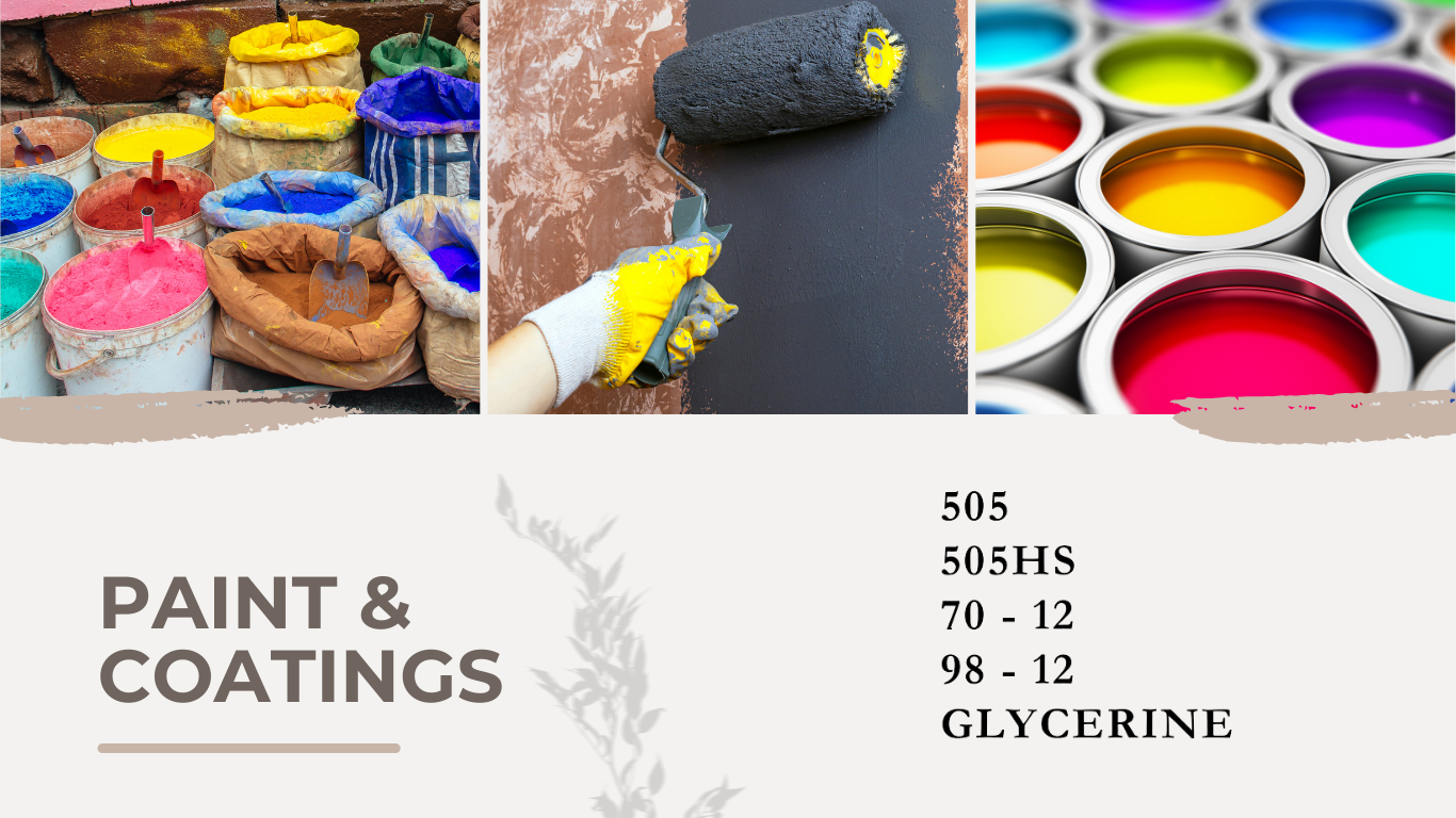 Summit Globe Trade offers palm oil–based oleochemicals for the paint and coatings industry, providing excellent stability, gloss, and durability. Our sustainable formulations enhance performance and environmental safety, meeting international standards for industrial and decorative applications.